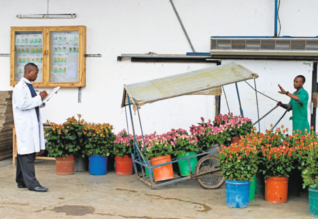 „Wollen wir nicht jetzt mal rausgehen?“, drängelt der Tansanier und verlässt nur zu gern den Kühlraum. In der Halle nebenan fällt hartes Neonlicht von der Decke. Etwa 120 Arbeiterinnen stehen an hüfthohen Arbeitstischen, an denen sie Rosen nach Stiellänge und Farben sortieren. Die Handgriffe sitzen, müssen sitzen, sollen doch die Rosen im perfekten Outfit die Käufer in Europa, in Köln, Amsterdam und Hamburg becircen.