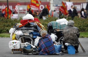 Obdachlose schauen einer Demonstration gegen Globalisierung und den Verlauf der Rezession in Rom zu.