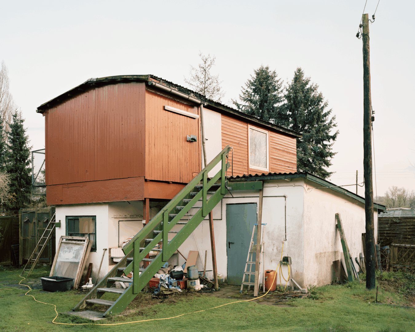 Enver Hirsch und Philipp Meuser glaubten lange, ein zum Fachwerkhaus aufgestocktes Behelfsheim an der Bille fotografiert zu haben. Bis sie genauer hinsahen. „Von der Konstruktion her ergab das Fachwerk keinen Sinn. Das Holz war tatsächlich aufgemalt“, sagt Meuser. Als sein Kompagnon Enver Hirsch und er auf der Suche nach Behelfsheimen durch die Stadt streiften, erlebten sie immer wieder Überraschungen: Weil sie sonst nicht unter einen Vorsprung gepasst hätte, hat der Bewohner eine Lampe verkehrt herum angeschraubt. In einem anderen Gebäude wurde ein Fenster unter ein Dach gequetscht, an einem weiteren Bau führt eine Treppe zu einem zweiten, bauwagenartigen Geschoss aus Holz. „Diese Häuser sind oft sehr individuell gestaltet. Sie sehen so ganz anders aus. Das interessierte uns“, sagt Hirsch.