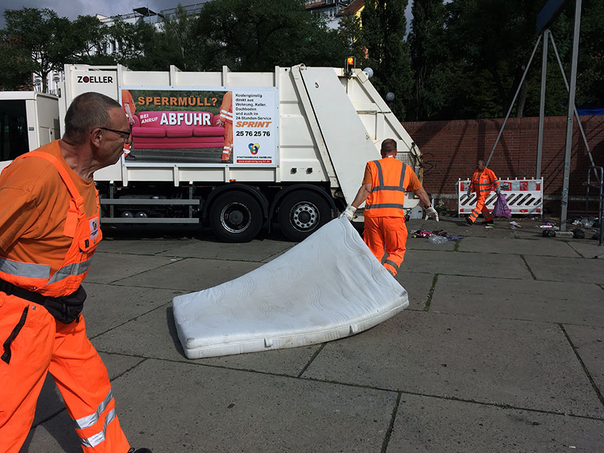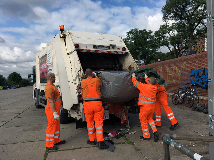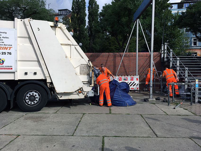 Unterdessen landen weitere Zelte, Matratzen und private Dinge im Müllwagen. Als ein Mitarbeiter der Stadtreinigung zögert, weil er am Zaun einen sorgfältig abgedeckten Rollwagen mit privaten Habseligkeiten sieht, herrscht ihn ein Bezirksmitarbeiter an: „Weg, alles weg!“ Der Bezirk Altona, so scheint es, will hier alle Spuren der Obdachlosen beseitigen – restlos.