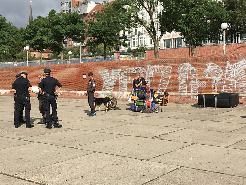 Die Lage während der Räumung bleibt ruhig. Viele seien schon gestern gegangen, erzählt Dennis. Die anderen packen friedlich ihre Sachen ein – nur als ein einsamer Punk aus Richtung Landungsbrücken grölend und gestikulierend die Szenerie betritt, greifen die Polizisten ein und wollen die Papiere des Mannes sehen, die er anstandslos präsentiert.
