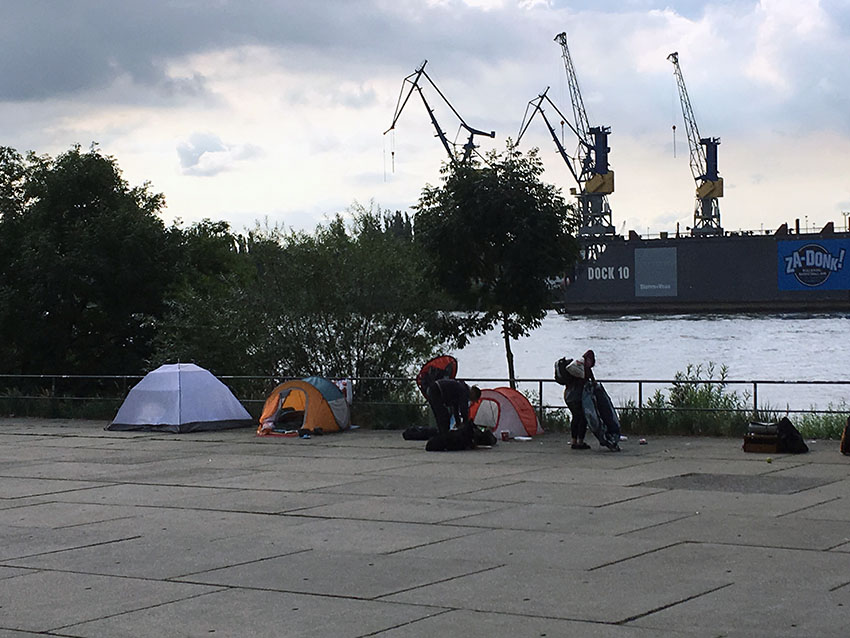 Es geht alles ganz schnell: Um Punkt 10 Uhr rückt ein Trupp der Stadreinigung am Fischmarkt an. Zelte, Matratzen, Kleidung – alles, was bis eben hier noch stand und lag, wird radikal weg geschmissen – unter den Augen von Polizisten, Bezirksmitarbeitern und Kamerateams.