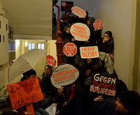 Mehr als 200 Menschen protestierten in Wilhelmsburg gegen die Zwangsräumung von Heiko G. Die Polizei räumte schließlich das Treppenhaus, damit der Gerichtsvollzieher den Räumungsbescheid überreichen konnte.