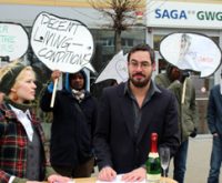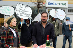 Mit einer satirischen Aktion haben am Donnerstag Aktivisten aus dem Netzwerk Recht auf Stadt auf Versäumnisse bei der Saga GWG hingewiesen. Von 300 wohnungslosen Familien, die seit dem Sommer auf eine Wohnung warten, hatte sie nur 39 ein Angebot unterbreitet.