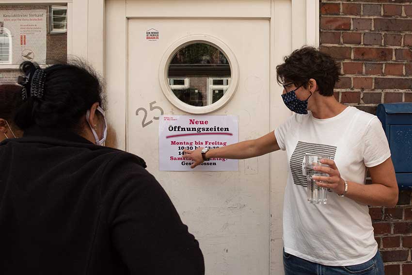 Vertriebsmitarbeiterin Meike Lehmann erklärt während einer kurzen Pause die Öffnungszeiten. Sie ist heute an einem Verkaufsfenster eingeteilt, um die Zeitungen auszugeben. „Ich freue mich sehr, dass all die Verkäufer hier sind“, sagt sie: „Ich habe zwar die ganze Zeit viel mit Verkäufer*innen telefoniert. Jetzt ist es aber einfach schön sie nicht nur zu hören, sondern endlich wieder zu sehen. Und die Freude ist wirklich beiderseits.“