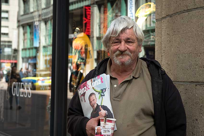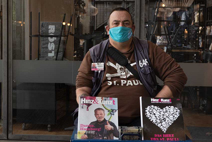 Hinz&Künztler Peter steht schon wieder an seinem Verkaufsplatz in der Spitalerstraße. Aber auch in den letzten Wochen konnte er nicht zuhause bleiben, erzählt er: „Jeden Morgen um sechs war ich an meinem anderen Verkaufsplatz am Jungfernstieg. Um den Kontakt zu meinen Stammkunden nicht zu verlieren.“ Umso größer war die Freude für Peter und die Kund*innen, als er am Mittwoch wieder mit Magazinen an seinem Verkaufplatz stand.
