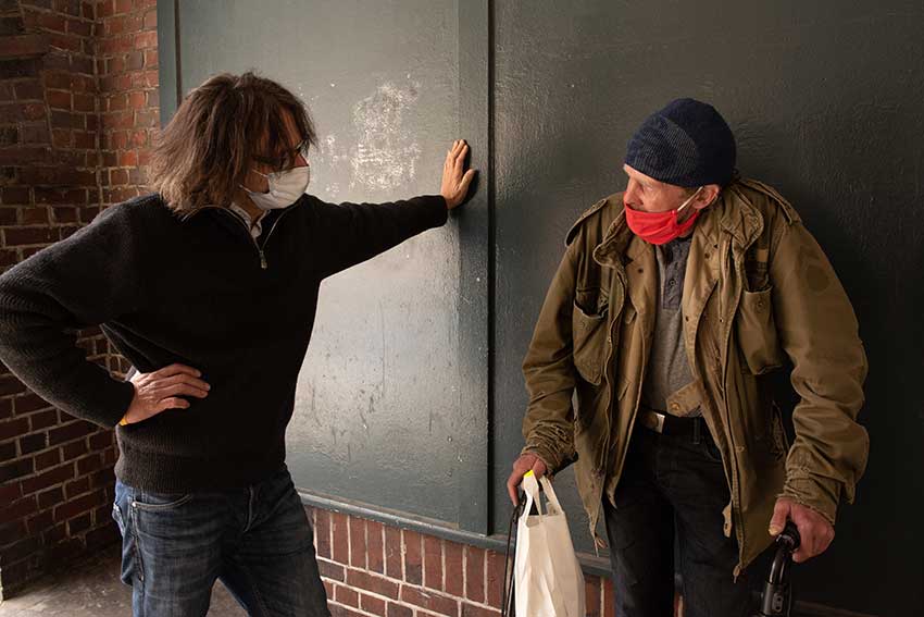 Sozialarbeiter Stephan Karrenbauer im Gespräch mit Hinz&Künztler Thomas. Endlich wieder Kontakt mit den Verkäufer*innen zu haben ist für Stephan Karrenbauer ein super Gefühl: „Ich bin einfach kein Homeoffice-Typ, ich brauche den Kontakt mit den Menschen“, sagt er und gibt zu: „Die letzten Monate gingen mir ziemlich an die Nieren.“ Und auch Thomas freut sich: „Ein richtig gutes Gefühl, dass ich wieder verkaufen kann!“