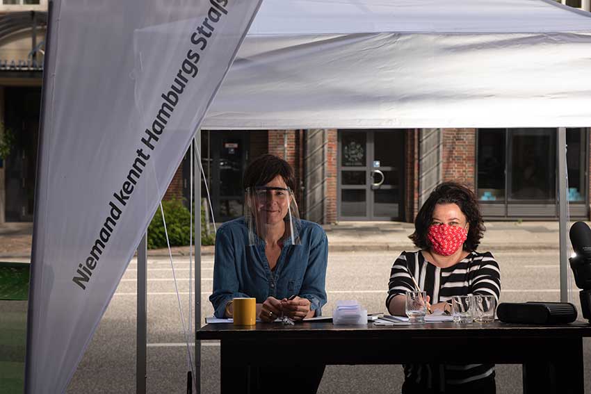 Die Sozialarbeiter*innen Isabel Kohler und Irina Mortoui bilden vormittags das Empfangskommitee. Hier müssen sich die Hinz&Künztler*innen anmelden.