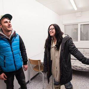 Kim und Stefan waren die Nummer 1 bei der Platzvergabe für die festen Winter-Wohncontainer. Jetzt wohnen sie auf dem idyllischen Gelände des Rauhen Hauses.