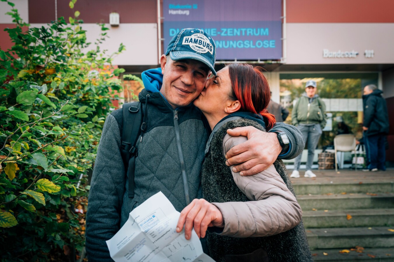 Ein eigener Container ist besonders wichtig für Joanna, die eine Hautkrankheit hat und sich schonen muss, sagt Eugen: „Noch schlafen wir auf Beton“, sagt er und macht eine Handbewegung nach unten. Joanna hält den blauen Zettel weiter fest in ihren Händen und strahlt. Nach zwei Jahren auf der Straße haben sie bald ein Dach über dem Kopf, auch wenn es nur aus Blech ist.