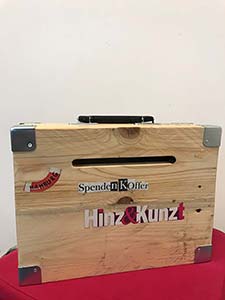 Sie möchten eine Spendenaktion durchführen und suchen ein geeignetes Spendensammelgefäß? Wir verleihen gerne unseren Spendenkoffer, Spendenhäuser oder unsere große Spendenbox. Bitte rufen Sie uns an oder schreiben Sie uns eine Mail, damit wir vereinbaren können, wie wir die Übergabe gestalten. Wichtig ist uns, dass niemand zum Spenden genötigt wird! Wir haben keine klassischen Spendendosen, es werden auch keine Spenden auf der Straße gesammelt für Hinz&Kunzt.