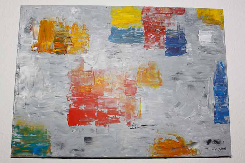 Auch Hinz&Künztler Marci steht lange vor seinem Traumbild mit dem blonden Jungen, der schwerelos vor einem abstrakten Großstadtpanorama schwebt. „Ich finde es sehr schön“, sagt er. „Die Stimmung, die das Bild rüberbringt, ist cool.“