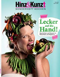 Aber bei aller Straßenküche: Wir wollten dann doch auch wieder selbst raus. Selbst ernten, sammeln – und Lebensmittel retten. Und vor allem: selbst kochen. Wir, das sind Mitglieder der Redaktion und Hinz&Künztler. In unserem Sondermagazin „Lecker auf die Hand“ kommen alle auf ihre Kosten: Fleischfans und Vegetarier.