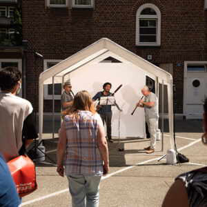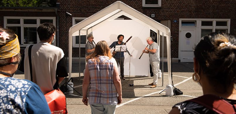 Eine Mittagspausen der ganz besonderen Art erlebten Hinz&Kunzt-Mitarbeiter*innen und -Verkäufer*innen am 23. Juni. Drei Musiker vom Philharmonischen Staatsorchester Hamburg präsentierten im Innenhof vor dem Verlagsgebäude Werke von Mozart, Ibert und Debussy zur Freude vor etwa 30 Hinz&Künztler*innen und zahlreichen Anwohner*innen, die interessiert der Musik von ihren Fensterbänken aus lauschten – auf Abstand, versteht sich.