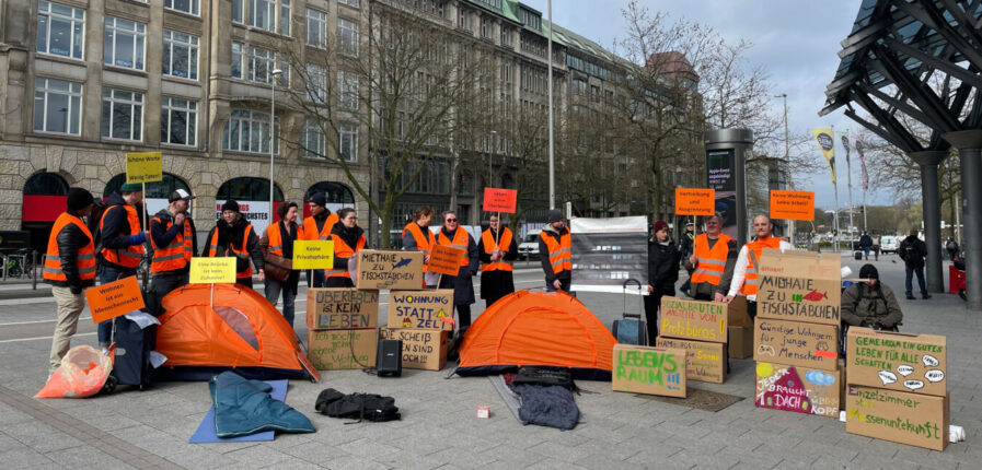 Ganzjährige niedrigschwellige Übernachtungsangebote für Obdachlose haben deshalb am Hauptbahnhof Sozialarbeitende vom „Hamburger Aktionsbündnis gegen Wohnungsnot“ bei einer Protestaktion gefordert. Auch Hinz&Kunzt ist Teil des Zusammenschlusses von Trägern der freien Wohlfahrtspflege. Auf symbolischen Umzugskartons prangten Schriftzüge wie: „Wohnung statt Zelt“, „Überleben ist kein Leben“ oder „Jede*r braucht ein Dach über dem Kopf“.