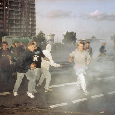 „Lichtenhagen war nicht der Anfang“, sagt Peer. „Angriffe von Nazis gegen alternative Jugendliche, aber vor allem gegen Migrantinnen und Migranten, waren an der Tagesordnung.“ Peer, damals 19, hatte seinen Freundeskreis im antifaschistischen Jugendalternativzentrum (JAZ) in Rostock. Auch die damals 16-jährige Katja gehörte dazu. Beide werden nur mit Vornamen genannt – sie möchten mit ihrer Biografie nicht für alle, die diesen Text lesen, identifizierbar sein. „Wir haben zu keinem Zeitpunkt das Ausmaß der Pogrome und die historische Dimension absehen können“, sagt Katja. Aber dass die rechte Szene in Lichtenhagen zuschlagen würde, sei schon lange vorher klar gewesen. Die Leute aus dem JAZ hielten sich bereit, riefen Freund:innen in anderen Bundesländern an, baten um Verstärkung. „Das Ziel war: Wir gehen da hin und intervenieren durch Masse. Wir wollten die Dynamik irgendwie unterbrechen“, erklärt Peer. Doch das war nicht einfach: Viele der zugereisten Antifaschist:innen kannten weder die Stadt noch ihre Mitstreitenden, Smartphones gab es noch nicht, zum Autofahren waren viele zu jung. Nicht alle hatten Erfahrung damit, Neonazis körperlich entgegenzutreten. Und sie waren zu wenige, die Rechten zu viele. Trotzdem versuchten die jungen Linken es am Sonntag erneut, mehrmals, bis in die Nacht hinein. „Es war stockduster, überall hat es geraucht, gebrannt, man hat nichts mehr gesehen“, erzählt Katja. Polizei habe sie nirgends sehen können. „Bürgerkrieg ist immer so ein hartes Wort. Aber von der Atmosphäre her, von der Angst her, die in der Luft lag und die man auch selber hatte… Wir waren 200 bis 300 und wir wussten ja: Am Tag standen da bis zu 3000 Zuschauer und Applaudierende und wer weiß wie viele hart organisierte Nazis.“ Als die Antifaschist:innen eine spontane Gegendemo starteten, wurden sie selbst festgenommen – auch Katja und Peer. „Ich konnte es nicht glauben“, erzählt sie. „Ich wusste ja: Ich mache etwas total Richtiges.“ Als sie am Montag aus der Gefangenensammelstelle kamen, stand das Sonnenblumenhaus längst in Flammen.
