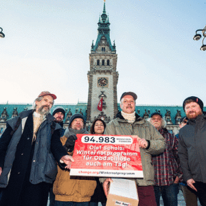 Zwei Monate lang sammelten Jörg Petersen und Hinz&Kunzt im Internet Unterschriften. Die Forderung des Initiators: Das Winternotprogramm solle nicht nur nachts, sondern auch am Tage allen Obdachlosen in Hamburg Schutz bieten. Nach etwa zwei Wochen hatten bereits mehr als 30.000 Menschen die Petition auf dem Online-Portal Change.org unterzeichnet.