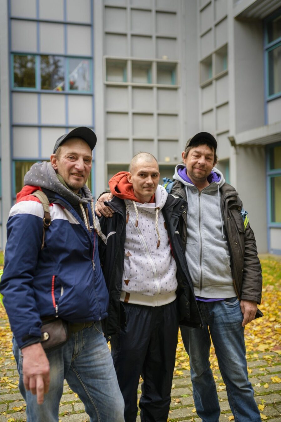 Pavol (von links), Patrik und Dariusz hatten Pech bei der Verlosung der Containerwohnplätze. „Über hundert Leute wollten einen Platz“, sagt Pavol frustriert. „Wir hatten keine Chance.“ Den Rest des Jahres haben die drei in Zelten geschlafen. „Aber Winter ist Katastrophe“, sagt Pavol. Trotzdem steht für sie fest: Ins städtische Winternotprogramm gehen sie nicht. Sie haben schlechte Erfahrungen gemacht: „Mir wurde alles geklaut, sogar Schuhe“, sagt Pavol. „Und tagsüber friert man und wird nass“, sagt Dariusz. Pavol macht gerade eine Therapie, um seine Alkoholkrankheit zu bekämpfen. Er könne nicht in eine große Unterkunft, wo viele Menschen Alkohol trinken. „Keine Ahnung, wo wir im Winter bleiben sollen“, sagt er. Foto: Imke Lass