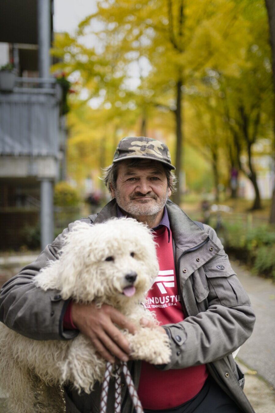 Viroel, 56, hatte Glück. Er hat einen der begehrten Plätze in einem Wohncontainer bekommen. Den Zettel mit dem Diakonie-Stempel, der sein Glück offiziell macht, behandelt der Hinz&Künztler wie seinen größten Schatz. „Ob ich glücklich bin?“ Er hält das Blatt Papier triumphierend in die Höhe. „Aber richtig!“ Er strahlt seinen Hund Max an. Mit ihm hätte Viroel im städtischen Winternotprogramm keine Chance gehabt. Dort sind Hunde verboten. Foto: Imke Lass