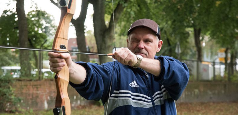 Alvydas greift nach dem Pfeil, spannt den Bogen und visiert kurz das Ziel an. Dann lässt er die Sehne los und der Pfeil schießt Richtung Scheibe. Knapp verfehlt er die Mitte. „Standbetreiber“ und Hinz&Kunzt-Mitarbeiter Sigi zückt seinen Block und notiert: Nur zwei Punkte. Alvydas aber ist das egal. „Macht doch nichts“, antwortet der gebürtige Lette und lacht. „Sowas habe ich ja auch noch nie gemacht.“