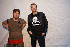 Bis es plötzlich während Lucas’ Rede draußen laut wird. Der zweite Hamburger Bus ist angekommen. Fast alles Punker. Freudig und lautstark werden sie von den Anwesenden begrüßt. Man kennt sich. Sei es von der ersten Straßenkonferenz vor zwei Jahren oder weil man irgendwo in der Republik bereits gemeinsam „Platte“ gemacht hat. Mit dabei: Hinz&Künztler Rico. Der 24-Jährige wuchs im Heim auf. Regeln waren nie sein Ding. Mit 14 Jahren fing alles an, er- zählt Rico. Punkrock, Kiffen, Alkohol und Konzerte. „Und am Wochenende kam ich – wenn überhaupt – nachts viel zu spät und besoffen zurück.“ Rico flog aus dem Heim, landete auf der Straße. Acht Jahre ist das her. „So lange bin ich vogelfrei“, sagt Rico, grinst und räumt aber auch ein: „So ’ne Punkerplatte, nee, das ist nix mehr für mich.“ Stattdessen macht Rico auf dem Kiez Platte.