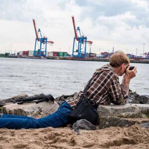 Reich war die fotografische Ausbeute auch beim zweiten Workshop zum Thema Elbe mit Fotografin Lena Maja Wöhler. Thomas legte sich mit seiner Kamera platt auf den Boden, um so die richtige Sicht auf ein Schiff zu haben. Gerrit machte einen Kniefall, um das Wasser besser in Augenschein nehmen zu können, und Mario ging für die Strandszenerie in die Hocke. Rainer machte sich dagegen unauffällig ans Werk – und schoss das Bild, das zum Deckblatt unseres Kalenders wurde: bunte Liebesschlösser auf einer Brücke. Auch Jürgen war dabei, allerdings hat der Hobbyfotograf die Elbe schon so oft abgelichtet, dass sie ihn als Motiv gar nicht mehr so sehr reizte. Der Vertriebsmitarbeiter war trotzdem dabei, „weil wir uns endlich mal wieder treffen“. Das war auch der Grund, warum wir dann länger in der Strandperle saßen, als auf Motivsuche zu gehen. War eben verdammt lang her, dass wir mal wieder so richtig quatschen konnten.